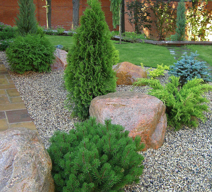 - 1 Ландшафтный дизайн с камнями и хвойниками