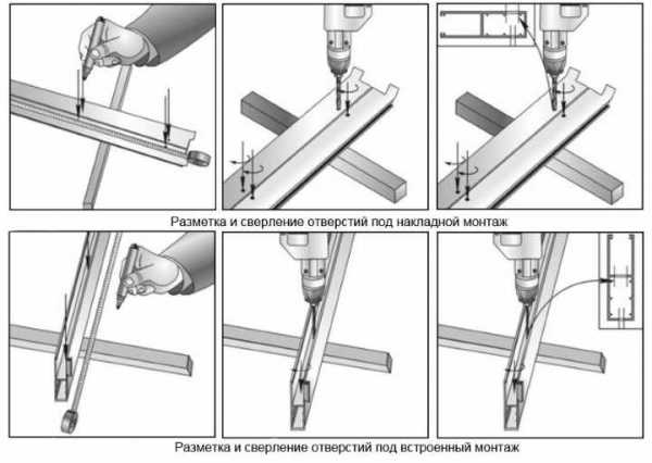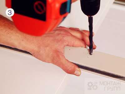 Маркером, рулетки на направляющих шинах намечают отверстия. Чтобы наметить отверстия, направляющие кладут на ровную поверхность. Отверстия намечают в десять или пятнадцать сантиметров от обрезов, направляющих и по всей длине с одинаковым расстоянием в сорок или пятьдесят сантиметров.- Для накладного монтажа отверстия передвигают ближе к внешнему краю краю направляющих. Далее сверлят отверстия диаметром восемь миллиметров.