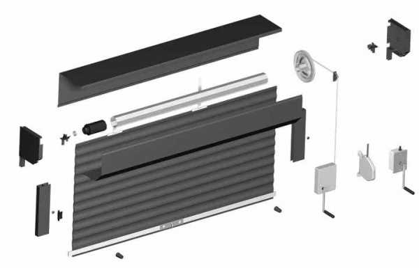 Основной частью роллетных систем является полотно, которое состоит из одинаковых по размеру ламелей. Профильные направляющие способствует равномерному движению всех планок полотнища. В коробе располагается механизм управления, который в зависимости от модели состоит из различных частей (рукояти или пульта). Блокировка системы осуществляется с помощью замков.
