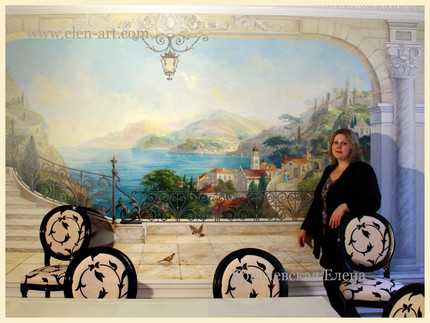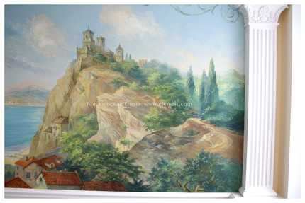 Роспись стен в пейзажном стиле всегда смотрится эффектно,и добавляет в помещение «воздуха». Видимо,человеку в четырех стенах всегда чуть-чуть не хватает простора…) Работая в этом направлении, я с помощью настенной росписи создаю целые волшебные миры: морской пейзаж и итальянские виды, восточный лес и города мечты.