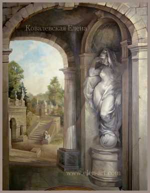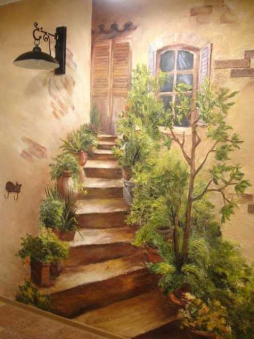С пейзажем всё более менее понятно,а вот что такое обманка? Роспись-обманка,или trompe l’oeil(фр.), это в первую очередь игра с человеческим восприятием. Иллюзия-главный изобразительный эффект,к которому стремится настенная роспись такого плана.Создаётся изображение,специально вводящее зрителя в заблуждение.Сейчас это модно называть 3D. Рисунок на плоскости создает эффект трёхмерного объёма.Хороший мастер может создать ощущение того,что мы смотрим на прекрасный пейзаж через окно или арку,или даже имеем возможность выйти на терассу…Или заставить изображение казаться объёмным,живым.Чем более точно провел свою работу художник,тем большему обману подвергается наше зрение.