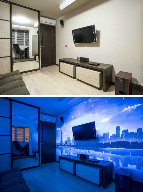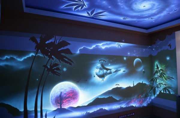 Пожалуй, самый фантастический вариант из нашей подборки. Роспись наносится на стену невидимой флуоресцентной краской, которая проявляется только при включении ультрафиолетового света (UV-светильников). Иногда такой рисунок наносится на уже имеющийся акриловый, добавляя ему сказочности, а порой дизайнеры выбирают простую однотонную стену, которая при естественном освещении даже не намекает о секрете, который скрывает. Это очень удобно, так как рисунок не надоедает.