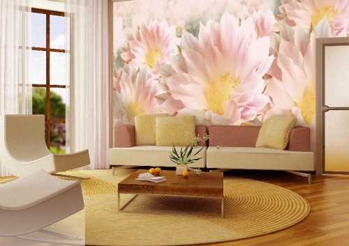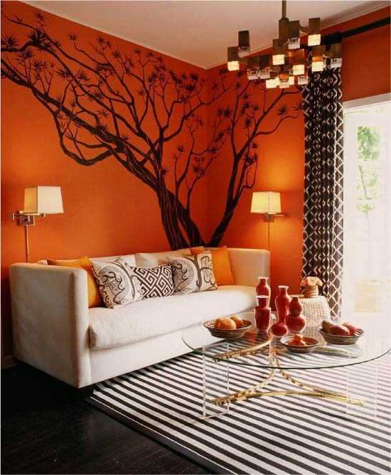 Желательно, чтобы настенный рисунок перекликался с какими-либо элементами интерьера, например, с подушками на диване, картиной на одной из стен, ковром, шторами или скатертью.