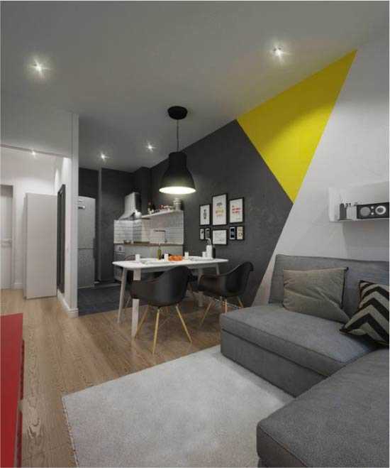 В современном интерьере уместнее окажутся геометрические принты, шеврон, горизонтальные полосы, абстрактные картинки.