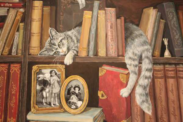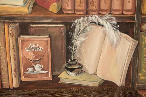 Самый сложный и одновременно самый интересный настенный рисунок мы видели в доме в английском стиле в Химках. Его первый этаж посвящен сказке «Алиса в стране чудес». Гордость хозяйки – нарисованная «библиотека в стиле Алисы в стране чудес» с тайным входом в зазеркалье. Отсылок к сказке на панно несколько: одноименная книга, баночка с волшебным зельем «выпей меня», «чеширский» кот и шахматная фигура королевы.