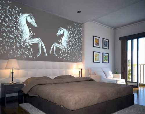 - Выбирая рисунок для стены, учитывайте ориентацию комнаты по сторонам света. Если окна помещения выходят на южную сторону, то для настенной росписи можно смело использовать холодные оттенки (голубой, синий, бирюзовый). Если же света в комнате не хватает, то советуем сделать ставку на теплые оттенки (желтый, оранжевый, коричневый, красный и прочие).
