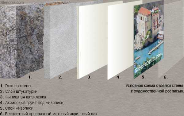 - Живопись. Как правило, рисунок выполняется акриловыми красками, но также по желанию заказчика можно использовать масляные краски. Если изображение наносится во влажном помещении, то используют специальные акриловые краски, которые позволяют получить достаточно прочную поверхность. Преимущество акриловых красок в том, что они не являются токсичными, разводятся обычной водой, довольно быстро сохнут, подходят практически для любой поверхности и универсальны в использовании. Высохшая акриловая краска образует прочную пленку, которая не смывается водой и устойчива к воздействию ультрафиолета. Такую роспись разрешается протирать влажными тряпками.