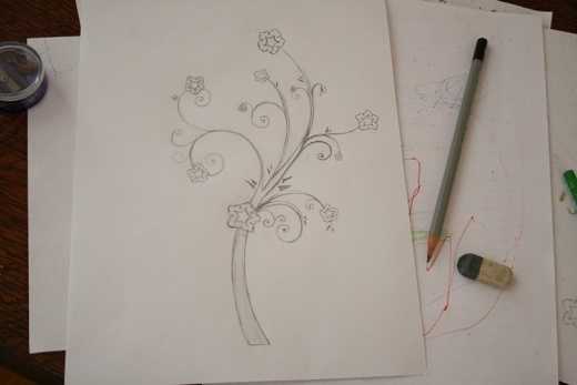 У меня на рисунке были цветы одного размера. Поэтому нарисовав один, я приложила к нему кальку и перевела на нее цветок.