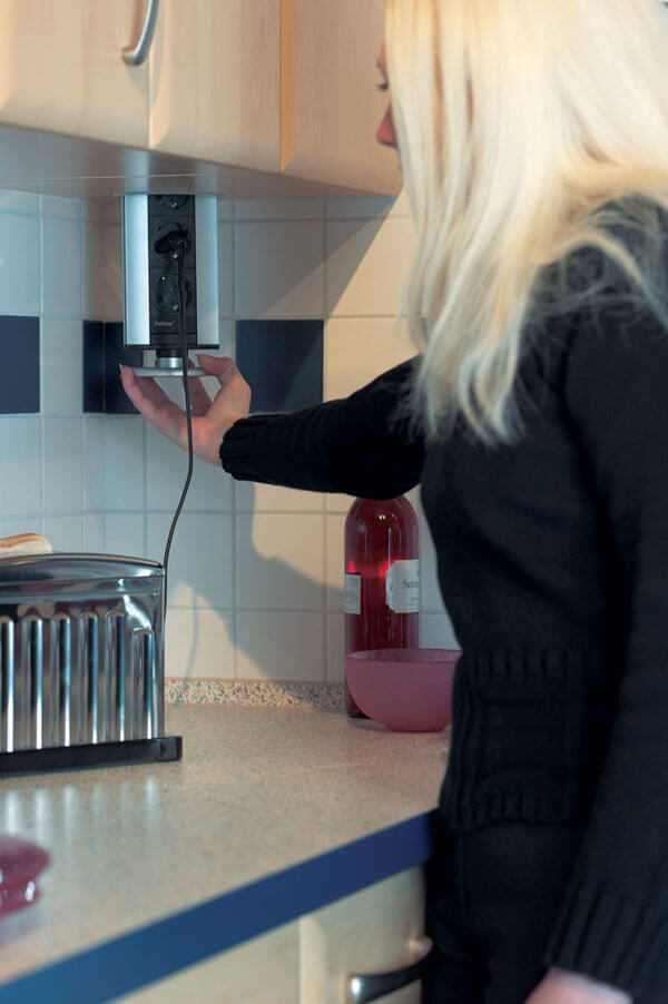 Принцип работы выдвижного вертикального блока довольно прост. Эта конструкция в нерабочем состоянии полностью скрыта в укромном месте – под столешницей/в навесном шкафу. Если требуется подключить кофемолку или другой бытовой прибор, то надо нажать на верхнюю защитную крышку выдвижной розетки. Она приоткроется на пару сантиметров. Далее, просто вытянуть весь блок вверх, пока он не зафиксируется.