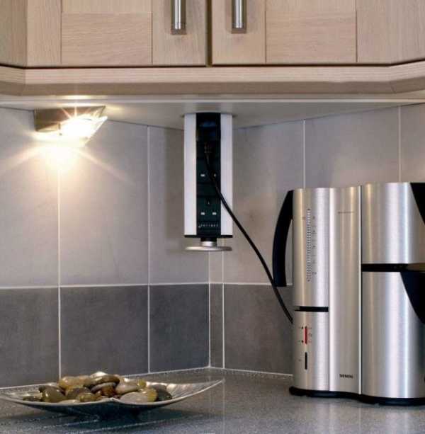 Для аппаратов среднего уровня в последние годы устанавливаются розетки в столешницу. Их разъемы скрыты от посторонних глаз. Устанавливаются они непосредственно на столешнице или на фартуке. Такого рода выдвижные устройства для кухни чаще всего состоят из блоков, в которые входят 3 или более розетки. Они утапливаются в шкаф. Для их выдвижения нужно легонько нажать пальцами на крышку.