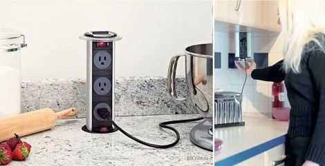 Выдвижная розетка скрывается в шкафчике, гарнитуре или где-то поблизости.
