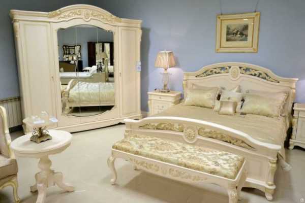 Люстры и настенные светильники должны быть в золотом цвете, мебель – в белом, а ковер, занавески, покрывало и изголовье постели – сочетать розовый и золотой цвет.