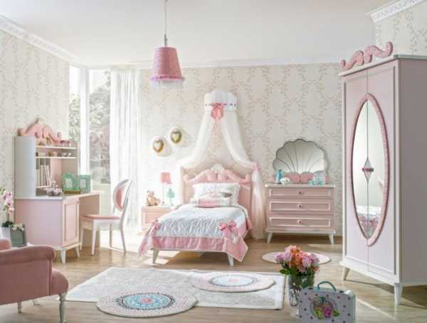 Если вы не хотите, чтобы вашего ребенка раздражал интерьер, стены, пол и потолок должны быть однотонными или украшенными простым геометрическим рисунком. Иногда используют пестрые обои, но не всегда это смотрится уместно. Чтобы ваша дочь чувствовала себя здесь настоящей принцессой, украсьте комнату текстилем розового цвета, купите кровать с резными ножками и полупрозрачным шифоновым балдахином, на пол положите ковер нежно-лилового цвета. Также в комнате должны быть рамки для фото, цветочные горшки, статуэтки и другие интерьерные мелочи розовых оттенков.