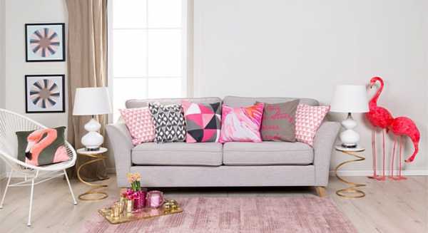 При упоминании розового цвета сразу вспоминается фламинго. Так что почему бы не внести изображение этого существа в оформление своей гостиной? В виде картины, отдельных декоративных фигурок, изображений на подушках, настенного декора или обоев с соответствующим принтом.