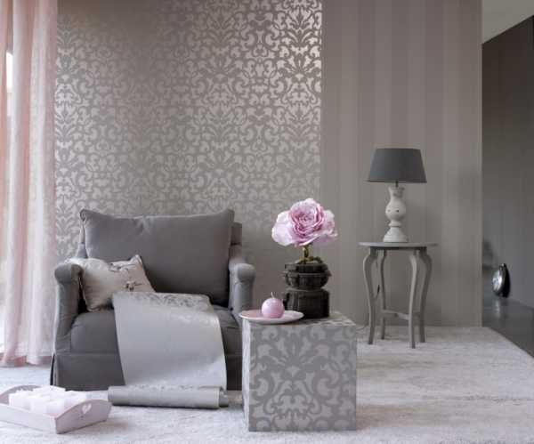 Замечательно будут смотреться предметы мебели с серо-розовой обивкой, имеющей классический, геометрический или растительный рисунок.