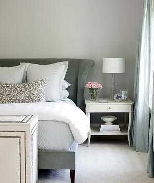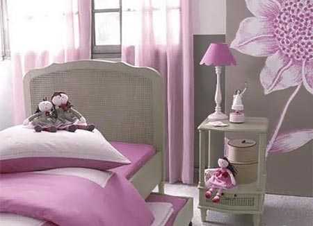 Во-вторых, цвета тщательно “перемешаны” – нет розовых объектов на розовом фоне или серых объектов на сером фоне. Тумбочка имеет другой оттенок серого и потому выделяется на фоне серой стены, которая к тому же предусмотрительно расписана бело-розовым цветком. Бело-розовое постельное белье хорошо выделяется на фоне серой кровати. Розовые шторы прекрасно контрастируют с серо-белыми стенами.