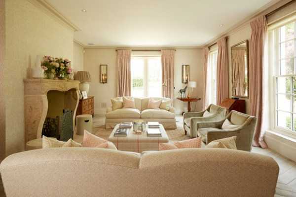 На фото гостиная комната в стиле неоклассика. Обивка мягкой мебели выполнена из пыльно-розового бархата.
