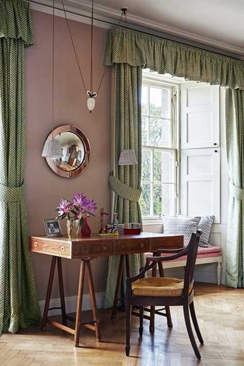 Текстильная часть создает атмосферу уюта в доме. Тюль нежно-розового оттенка будет гармонично смотреться как самостоятельно, так и в комбинации с плотными портьерами, например грязно-розового цвета ил в серо-розовом сочетании. Для балкона или кабинета можно использовать жалюзи, а в кухне и детской хорошо будут смотреться римские шторы или занавески розово-персикового оттенка.