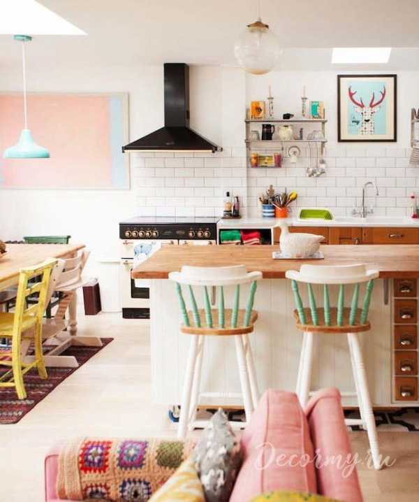 Оформление стен можно украсить с помощью фотообоев или комбинации с другим комплементарным тоном. Так же розовым цветом можно отделать область кухонного фартука. Другим вариантом оформления станет кухонный гарнитур из нежных или наоборот ярких красок.