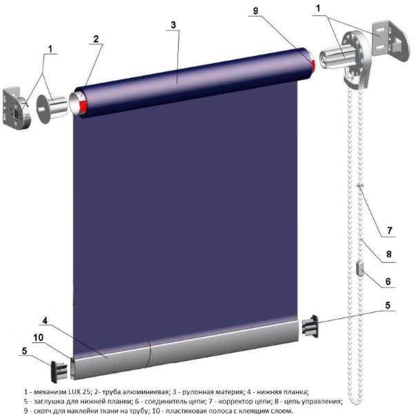 Приходят в разобранном виде. Перед монтажом необходимо проверить наличие составных частей. Произвести сборку. Она чрезвычайно проста. Рулонный механизм с тканевым материалом с одной стороны заглушается цепным механизмом. С другой — декоративным наконечником. Отдельно идут кронштейны, короб, направляющие, зажимы. Комплектация зависит от выбранной модели.