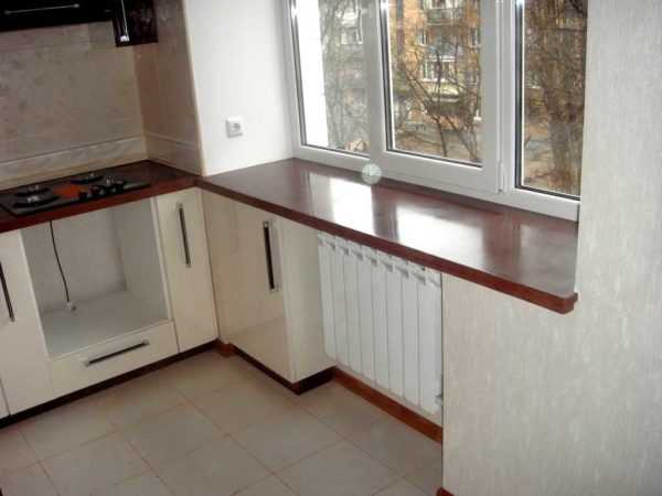 Рекомендуется сделать подоконник из столешницы, и использовать его как разделочный стол, что сэкономит пространство. Вместо большой плиты поставьте небольшой духовой шкаф и дополните его варочной панелью. Мойку традиционно монтируют в угол, холодильник можно поместить в шкаф для экономии площади. Еще можно спрятать в шкаф газовую колонку или новый газовый котел. Стеновое пространство лучше использовать для шкафов.