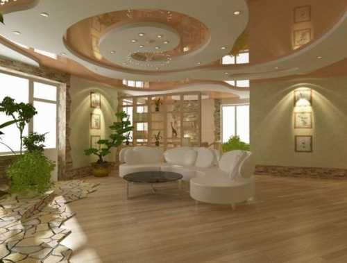 Однако это далеко не все возможные варианты. В продаже есть навесные и натяжные потолки. Работа с данными дорогостоящими материалами требует навыков и опыта. Поэтому для ремонта зала своими руками лучше остановиться на краске или плитке. Чтобы обустроить дорогостоящие потолки, стоит пригласить специалистов. От качества проделанной работы зависит как внешний вид отделки, так и ее долговечность. Для устройства потолка представлено множество материалов. Можно создать как гладкий потолок, так и покрытие с оригинальным орнаментом или выполненное в необычной цветовой комбинации. Натяжной потолок в зал будет лучшим вариантом. При монтаже натяжного потолка не нужно удалять старые отделочные материалы. Еще один плюс натяжных потолков в зале, это то что он идеально ровный.