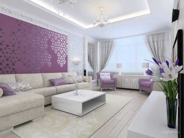 Сочетание белого и сиреневого цветов в интерьере гостиной