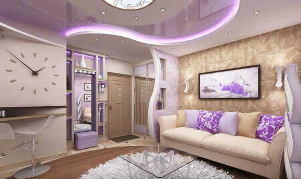 Многоуровневый потолок в сиреневой гостиной