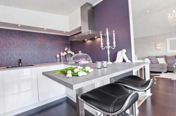 Использование сиреневого цвета в интерьере кухни освежит помещение, создаст ощущение бодрости и энергичности. Подчеркнуть стиль можно при помощи мебели более темного оттенка фиолетового цвета и серебристого декора. Большинство дизайнеров придерживаются мнения, что в случае совмещение кухни и столовой не стоит использовать винные оттенки, так как они способствуют повышению аппетита.