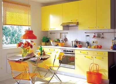 Для оформления кухонь наиболее подходят ярко-желтые тона, в то время как в спальню лучше подбирать бледные матовые. Для бледно-желтого цвета характерно расслабление и спокойствие. Желтый цвет в интерьере комнат удачно сочетается с черным, чем придает помещению оригинальность и воодушевление. В дизайне интерьера желтый цвет без проблем сочетается с другими тонами.