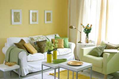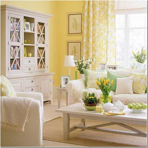 Применив природное сочетание цветов в оформлении интерьера, гостиную можно сделать в бело-желтом цвете, а колорита дизайну добавит нежный оттенок салатовых деталей, используемых в отделке комнаты.
