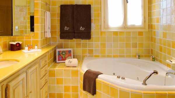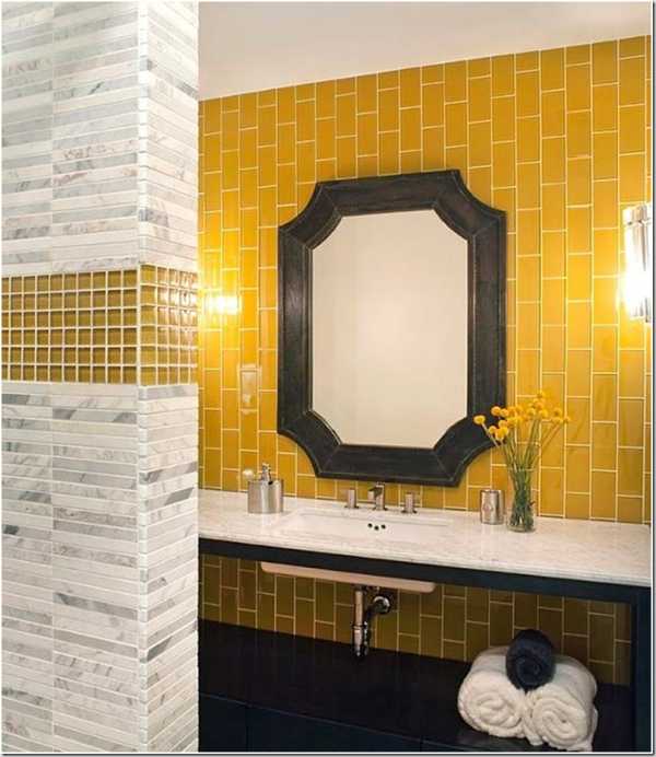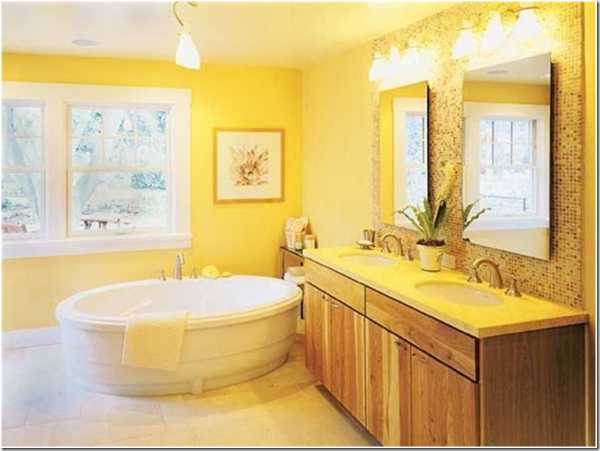 Если оформить ванную в желтом цвете, она будет казаться огромной и просторной. Добавив зеркала, можно еще больше расширить и увеличить комнату. Для ванной легко подобрать отделочные материалы теплой палитры желтого и темно-коричневого. Эти два цвета удачно гармонируют между собой, придавая мягкость помещению.