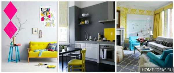 Серый отлично подходит ко всем цветам. Но лучшая пара для него – это желтый, поскольку такое сочетание символизирует серебро и золото, а также серое небо с пробивающимися сквозь тучи лучами солнца. Желтый и серый подходит для современного интерьера и в то же время – для классики.