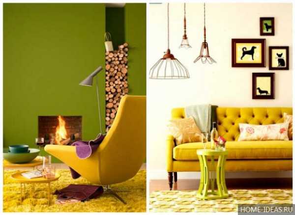 сочетание желтого цвета с зеленым и оранжевым для гостиной