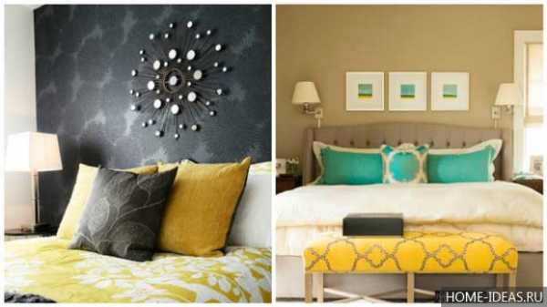 Можно красиво оформить изголовье кровати, повесив интересную картину, украсив комнату декоративными безделушками желтого цвета, фото, поделками ручной работы. В интерьере гостиной желательно использовать оттенки спокойных тонов.