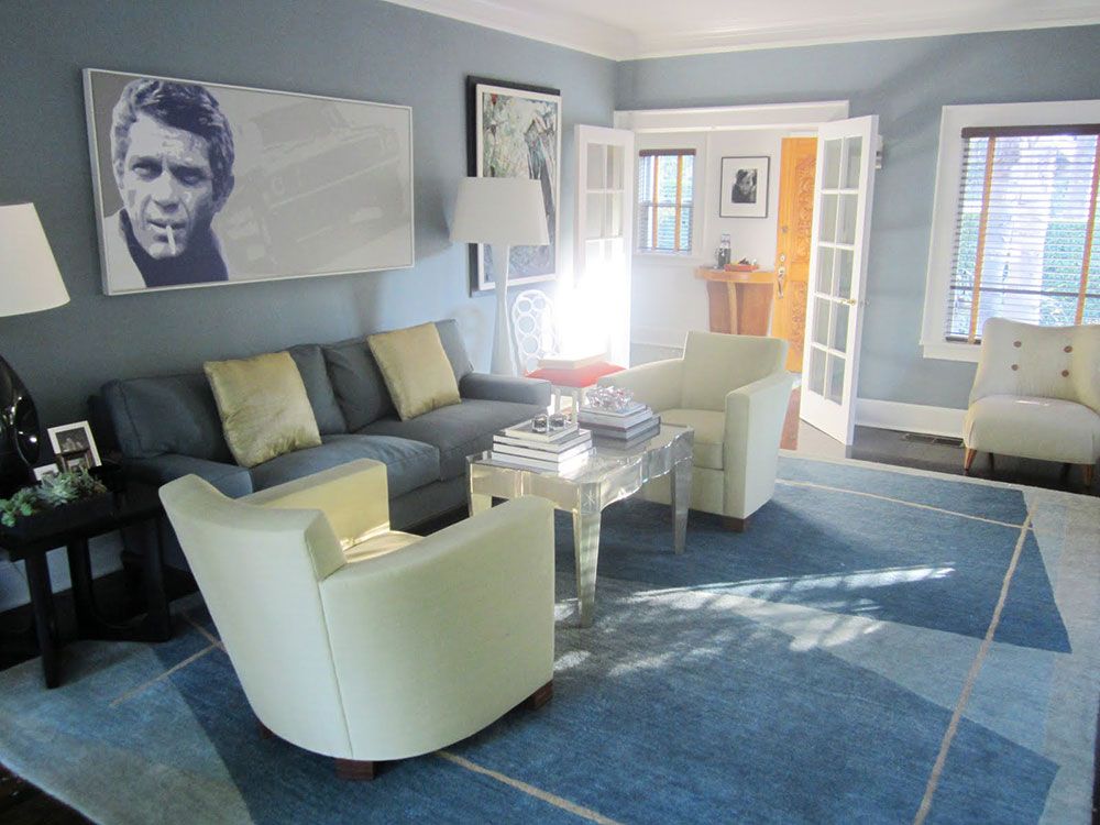 Данную комбинацию применяют, если синий цвет кажется чрезмерно насыщенным. Присутствие голубого придает воздушность комнате, делает ее свежей и воздушней. На основании данной комбинации можно оформить зал в средиземноморском стиле. При использовании комбинации сделайте стены серыми, а предметы мебели голубыми (либо наоборот).