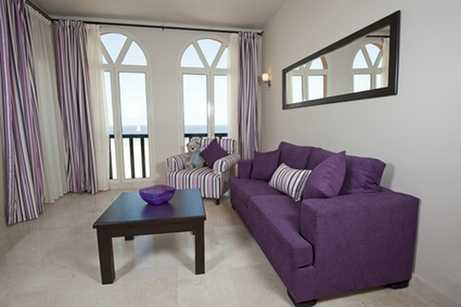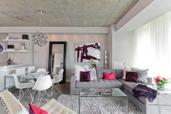 Роскошный пурпурный в сочетании с серым и белым выглядит в гостиной очень элегантно.