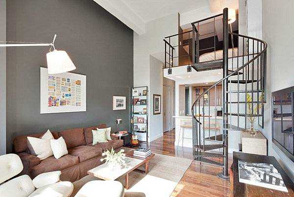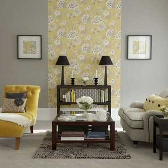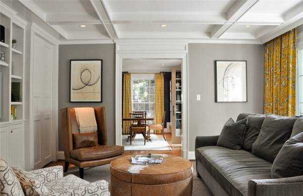 Все стены или большая часть стен окрашивается в серый. Мебель может быть установлена серая, черная, белая или цвета дерева. Желтый цвет в интерьер вводится небольшими количествами: это может быть, например, одно желтое кресло, желтая полоска стены, желтая штора и желтый абажур.