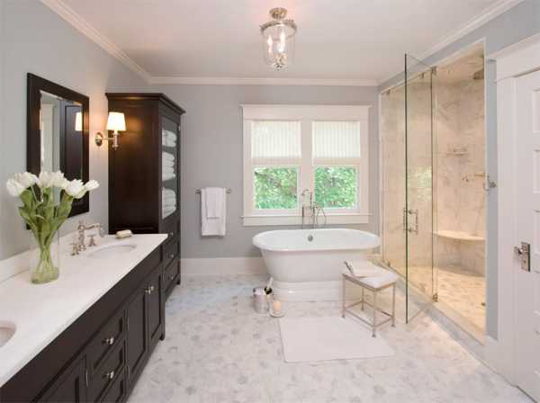 Непринужденная атмосфера этой ванной комнаты создается светло-серым цветом ее стен.