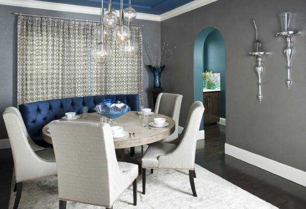 Вся синяя гамма (от небесно-голубого до кобальта и индиго) замечательно оттеняет серый цвет, создавая строгий, благородный интерьер.