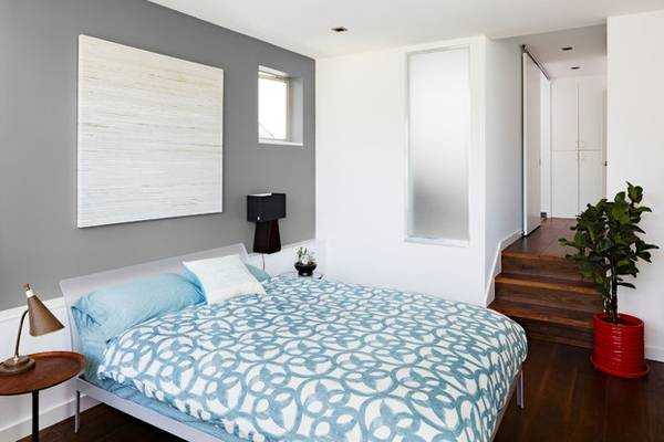 Минималистичная спальня в голубовато-серых тонах.