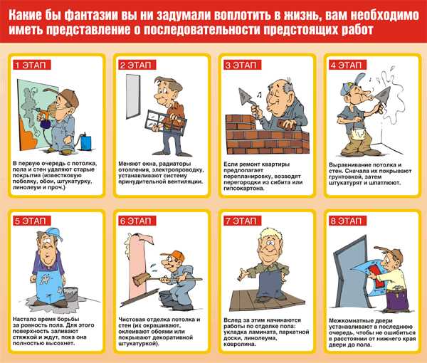 Ремонтные работы следует начать с самых пыльных работ — замены окон, отделки откосов и монтажа подоконников. Затем нужно выполнить замену проводки, закрыв предварительно новые окна полиэтиленовой пленкой. После этого можно приступать к отделке потолка, стен и пола. Сначала выполняются шпаклевочные, цементные и затем уже гипсовые работы. Затем уже идут отделочные работы — оклейка и покраска потолка, оклейка или покраска стен, укладка ламината или паркета, и потом уже монтаж плинтусов и наличников. Ремонт в отдельной комнате может и не потребовать замены проводки, установки окон и т.д., а может включать лишь отделку потолков, отделку стен (шпаклевка, покраска, наклейка обоев), укладку нового напольного покрытия.