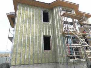 Для утепления, как правило, используются рулонные материалы типа Урса или Изовер и т.п. Могут быть применены и маты, с ними удобней работать одному мастеру. Ширина полотна 610 мм (это примерная величина), потому шаг между направляющими не более 60 мм. Непосредственно во время монтажа шаг устанавливается с учетом ширины утеплителя. При установке горизонтального винилового сайдинга, планки крепятся к поверхности фасада вертикально, если здание обшивается вертикальным сайдингом – планку крепят горизонтально. При помощи прямых подвесов выравнивается уровень, на который устанавливается планка обрешетки.