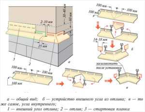 Монтаж отливов и стартового профиляОтлив монтируется с угла. Отрезается метровый кусок отлива. В нем необходимо сделать вырез так, чтобы образовался нужный угол внешний или наружный. Каждый последующий отлив устанавливается внахлест в 2,5 см.