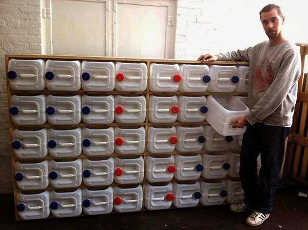 Кроме того, мастера используют различные хитрости в гараже – своими руками сооружают стеллаж из пластмассовых канистр. Подойдут одинаковые емкости, ручка у которых находится вверху. Одну из сторон вырезают, превращая канистру в оригинальный ящик для ценных вещей автолюбителя. Затем емкости устанавливают на деревянный или металлический стеллаж, как показано на фото. Такие системы хранения для гаража служат автолюбителям долгие годы. Поскольку пластик не боится сырости, перепадов температуры и устойчив к механическим повреждениям. В результате у мудрого мастера все детали находятся под рукой, а значит, он работает без отвлечений.