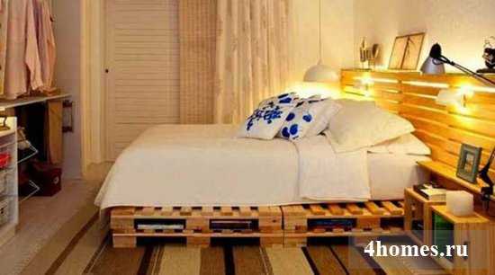 Кровать и большое изголовье для неё с полочками тоже сделано из паллет. Хороший ортопедический матрас позволит даже на таком оригинальном основании отлично выспаться.