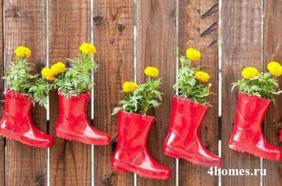 Вертикальное озеленение с помощью красочных резиновых сапог. В их подошвах сделайте отверстия для оттока лишней воды и устройте дренаж из керамзита. Наполните обувь грунтом и высадите растения. Помните, что любая ёмкость, не углубленная в землю, быстро нагревается на солнце, земля в ней высыхает. Поэтому в жаркие дни поливайте зелёных питомцев минимум 1–2 раза в сутки.