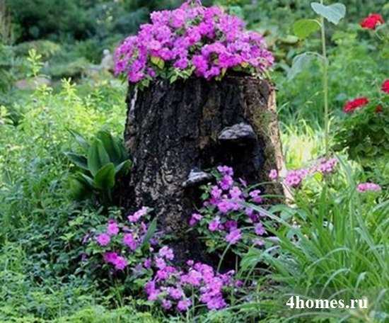Если на участке есть крайне непривлекательный пень от старого дерева, выкорчевать который нет возможности, не расстраивайтесь. Из него получится отличная приподнятая клумба.
