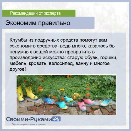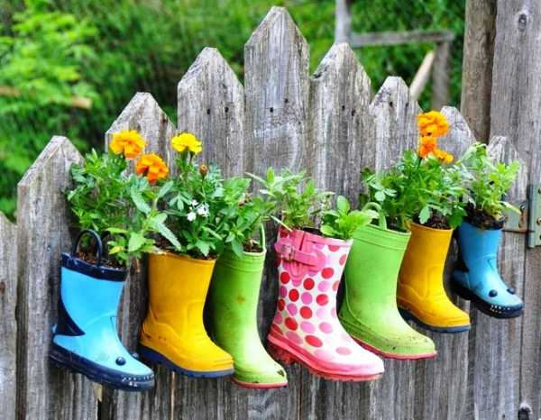 В саду старая ванна, потертый деревянный стул, лейка смогут стать основой для цветника, даже старая обувь могут стать основой для кашпо. Такое необычное применение старых вещей вызовет восхищение у соседей и ваших гостей.