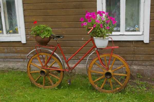 Превратить в подставку для цветов можно старый велосипед. На нем разместите небольшие кашпо с декоративными растениями и цветами. Лучше, если они будут разными: низкими и средними по высоте, свисающими, разных цветов и формы.